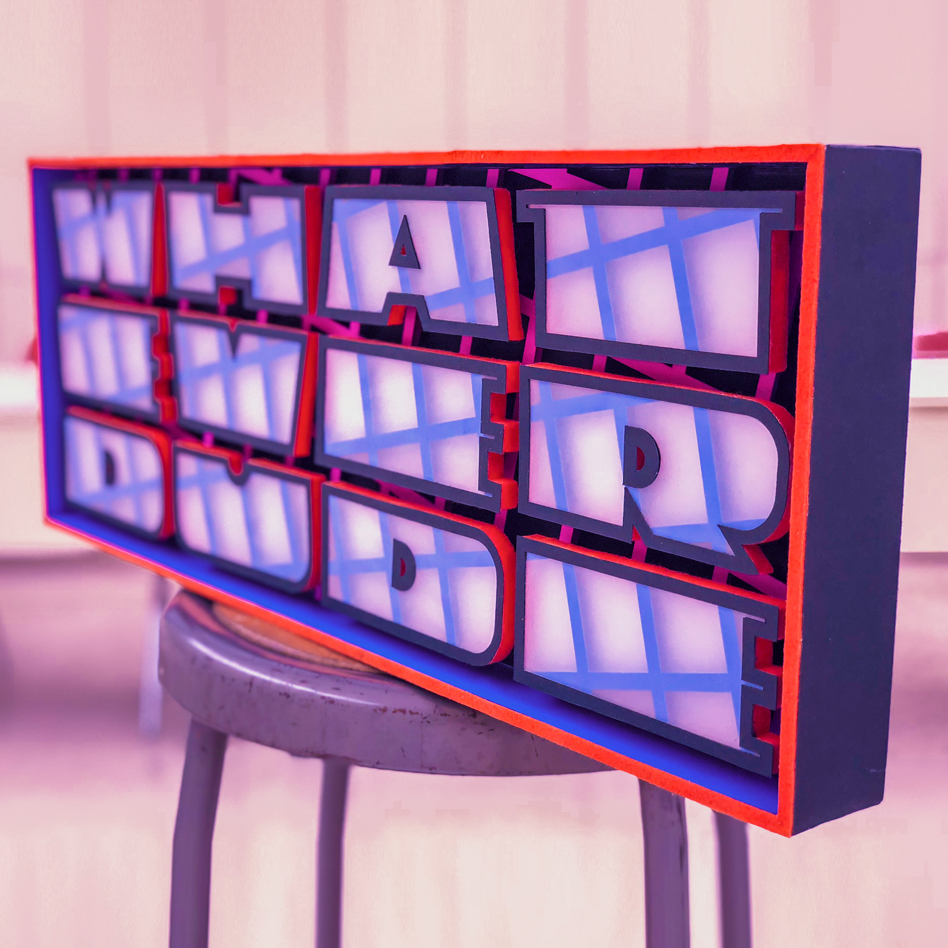 The base is covered in a very matte black sheet. A bright magenta grid is slightly lifted off that surface which causes the eye to make the background look even darker then it already is. The walls have a black outer face with a cyan inner face and trimmed with a bold orange felt. The letter forms are composed of a white base with a cyan grid which is diffused with a translucent layer. Lastly, there is a black outline on the letters. They have orange felt on the outer sides to tie it in with the base and increase visual interest when viewed from the side.